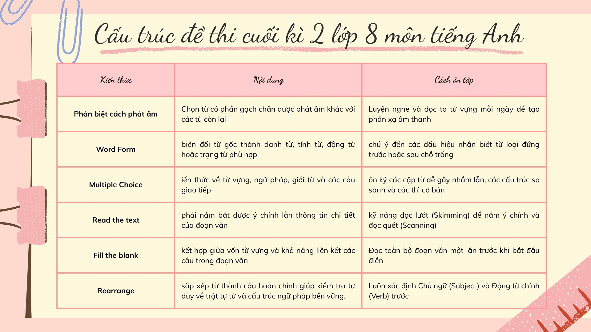 Cấu trúc đề thi cuối kì 2 lớp 8 môn tiếng Anh thường gặp